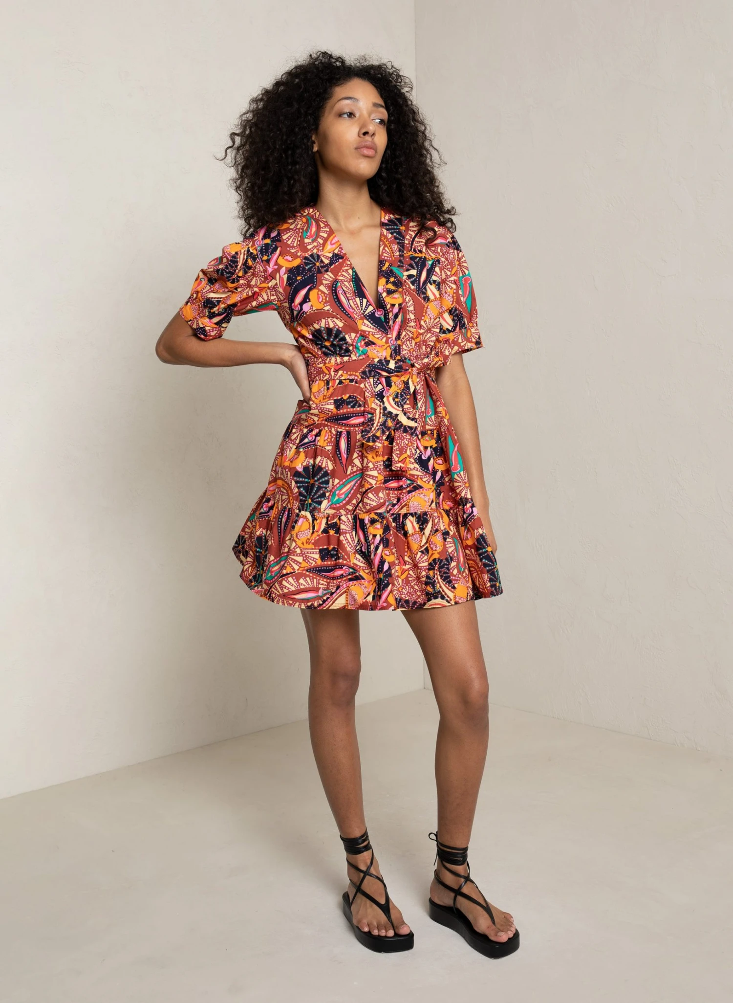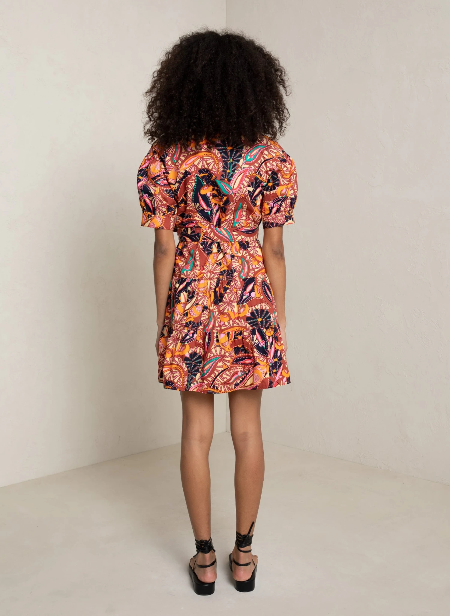 The Carey Dress is crafted from our easy day cotton fabric in a kaleidoscopic print. This tiered mini silhouette features short puffy sleeves that flow into a V-neckline with a self-tie sash to cinch your waist. Shop Dresses