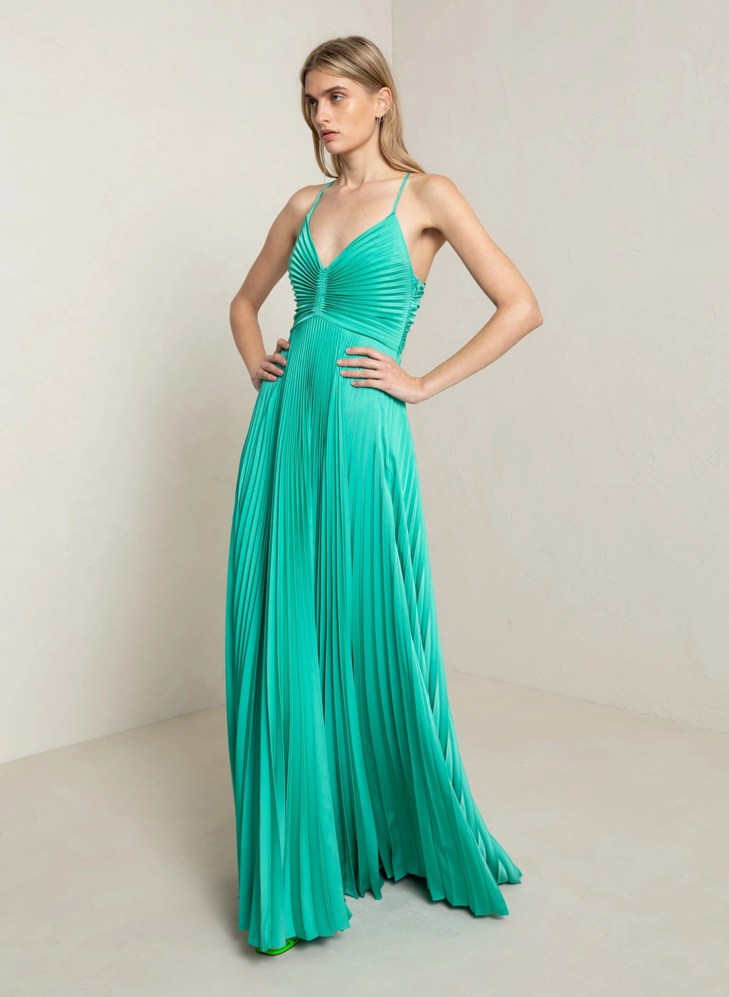 The Aries Dress is crafted from our vintage satin in an emerald green hue. This maxi silhouette features a V-neckline and pleating throughout with a ruched bodice that wraps to the back, revealing a low cutout. Shop Dresses