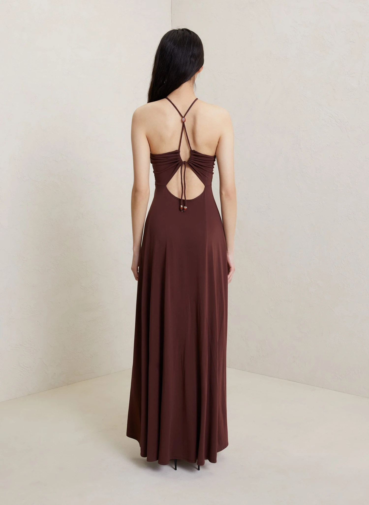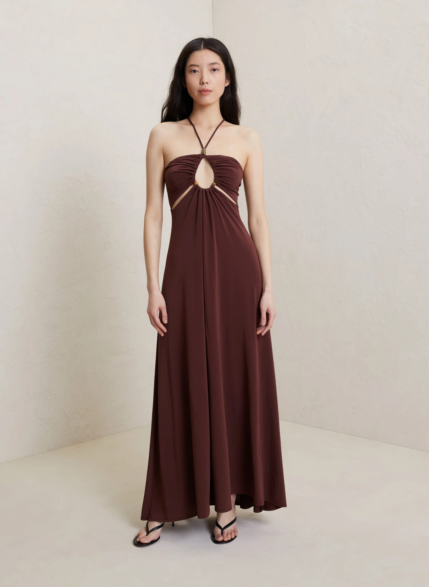 The Gabrielle Dress is crafted from a stretch viscose blend in a rich chocolate brown. This maxi silhouette features a halter neckline detailed with colorful beads and cutouts through the bodice that extends to reveal an open back. Shop Dresses