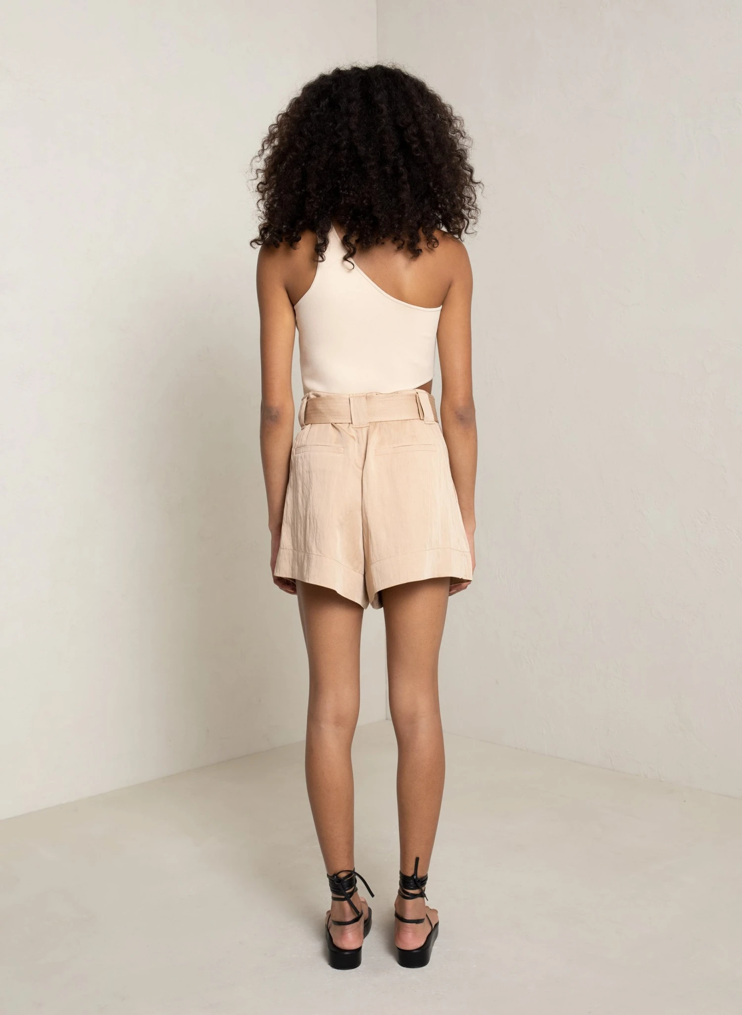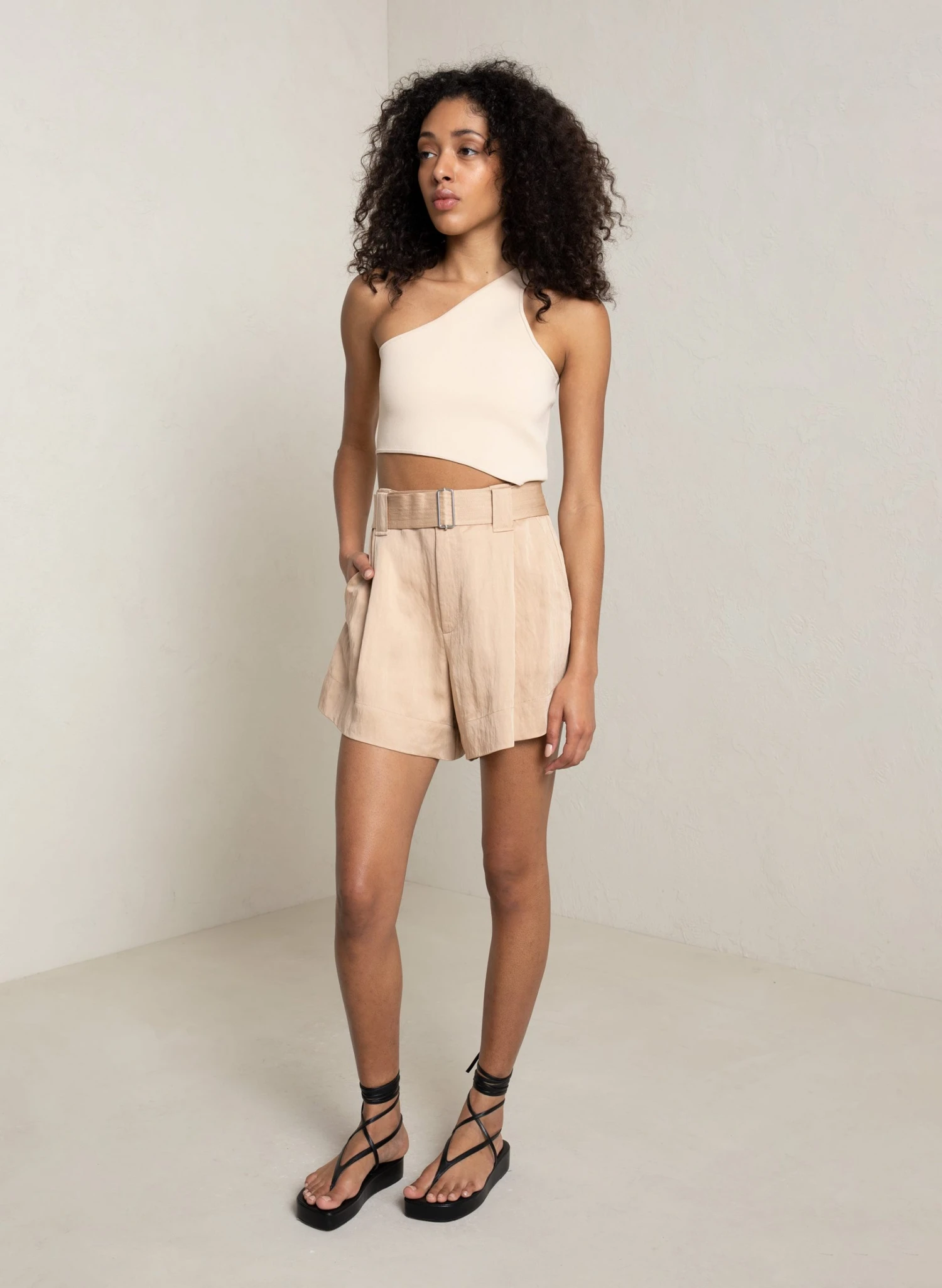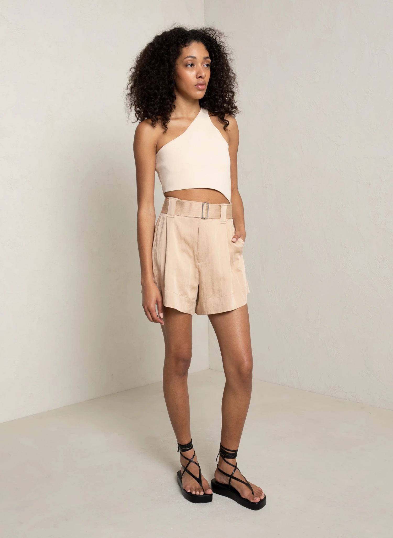 The Grayson Short is crafted in our relaxed viscose fabric in an earthy shade of tan. This fluid silhouette is pleated, featuring a matching belt and side slit pockets.