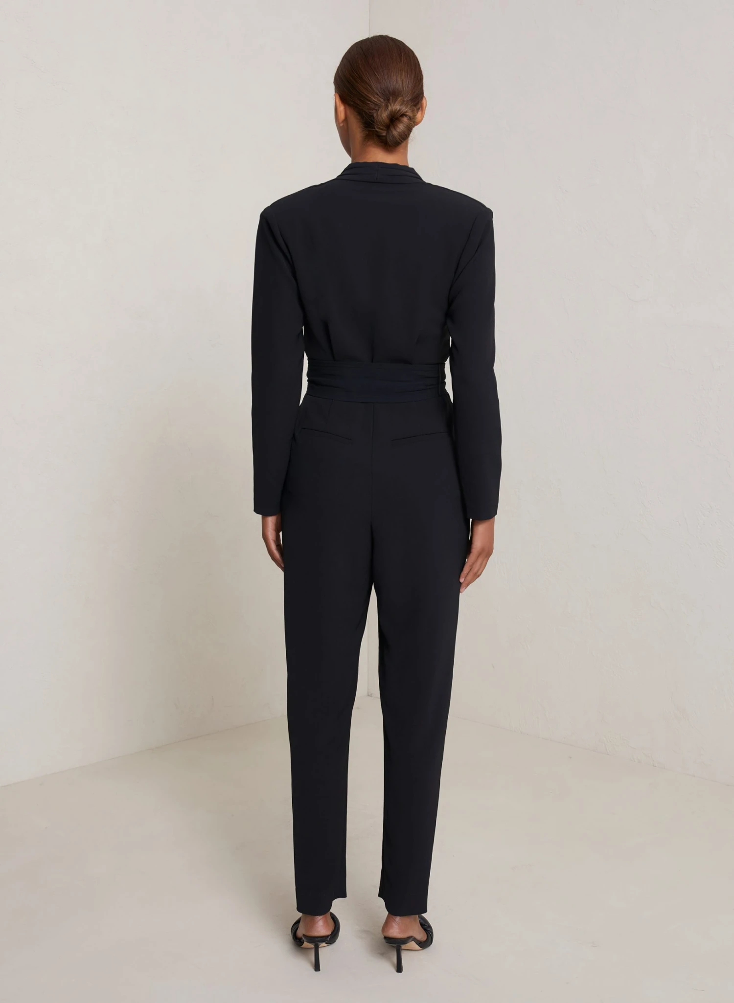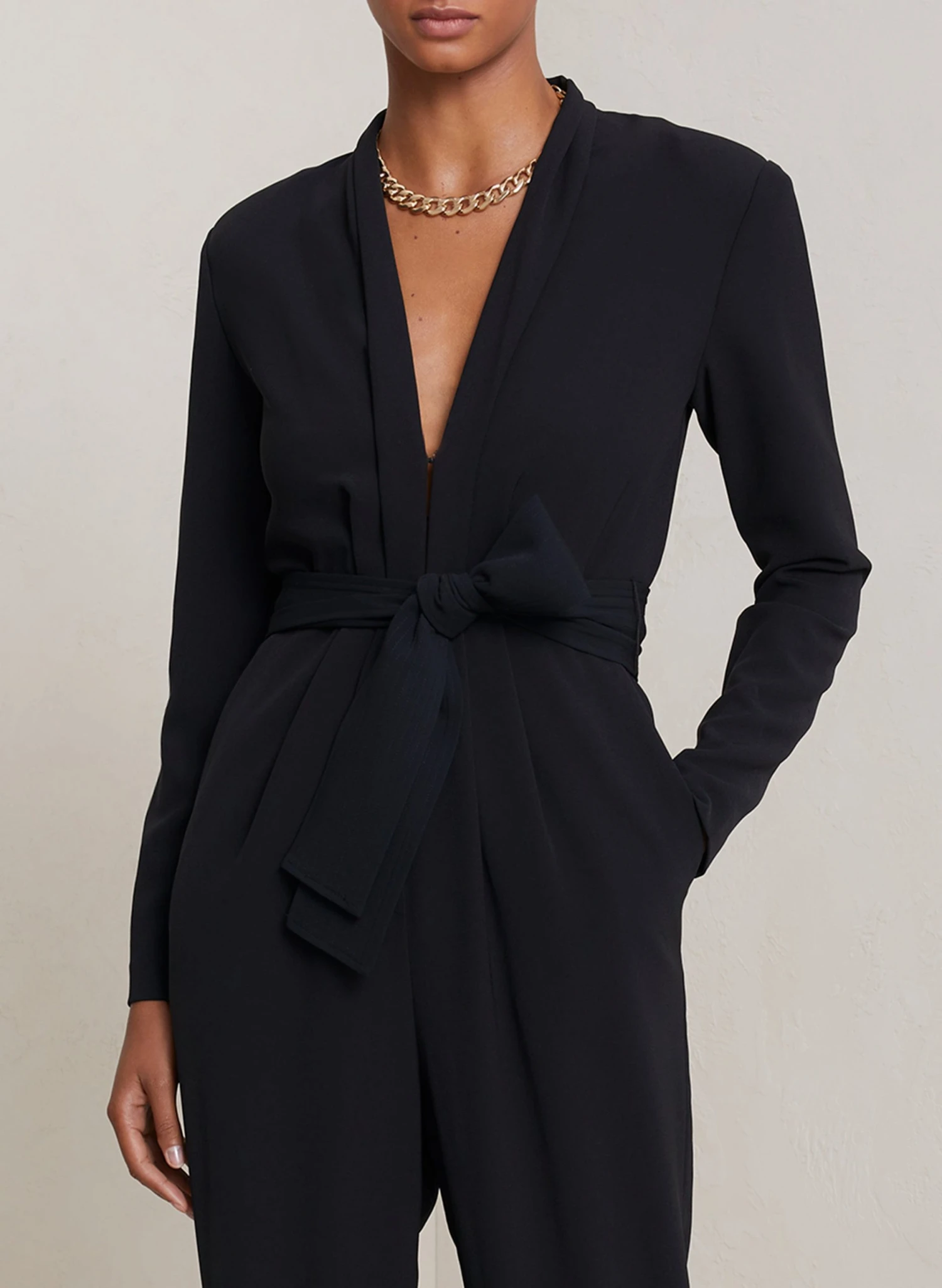 Shoulder pads add structure to our effortlessly chic long sleeve crepe jumpsuit. A quilted belt defines the darted waist, and a plunging neckline adds sophisticated sex appeal.