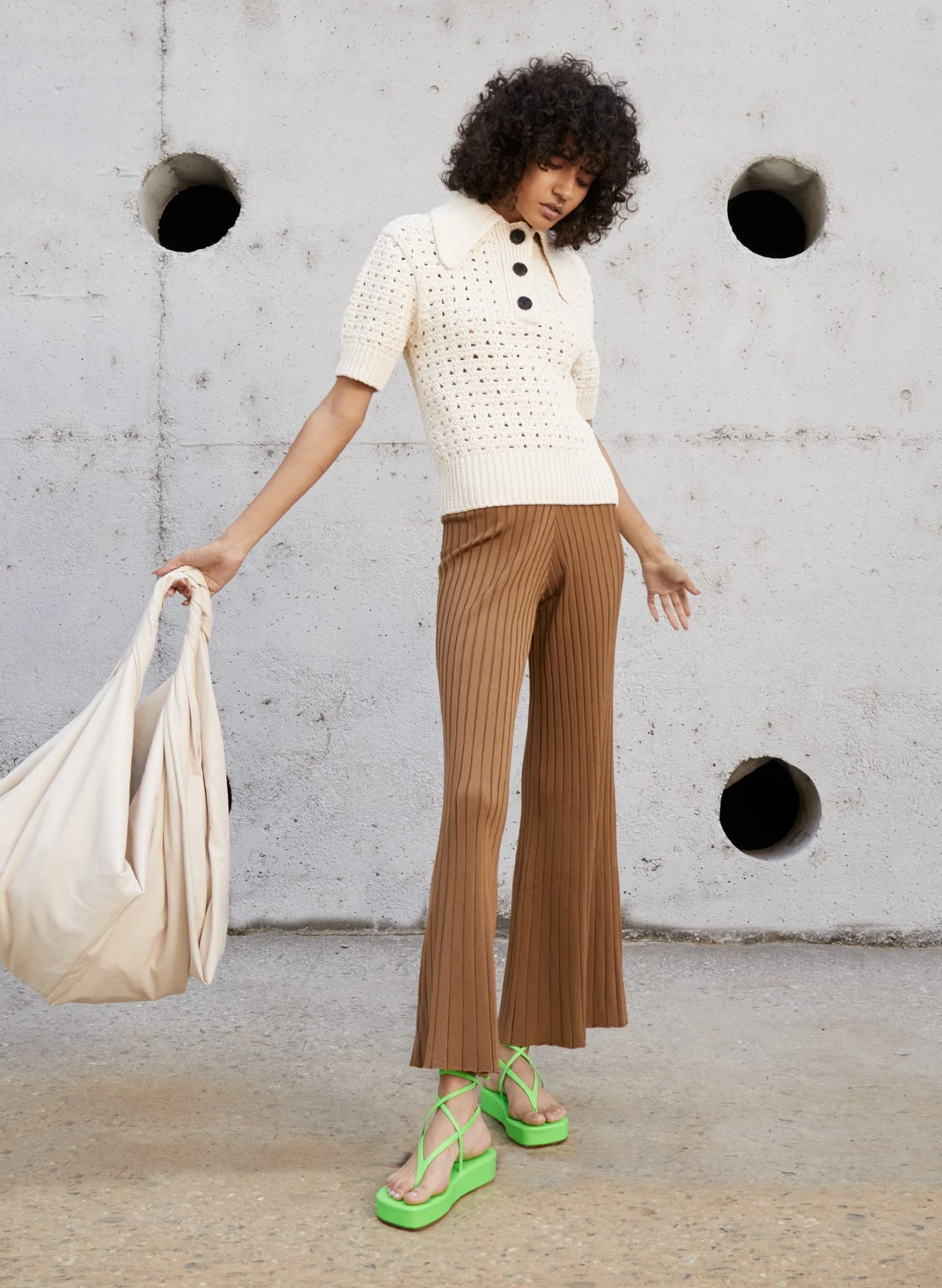 The Astrid Pant is knitted from so-soft viscose in a warm brown hue. This ribbed design features gently flared legs and a comfortable stretch waist.