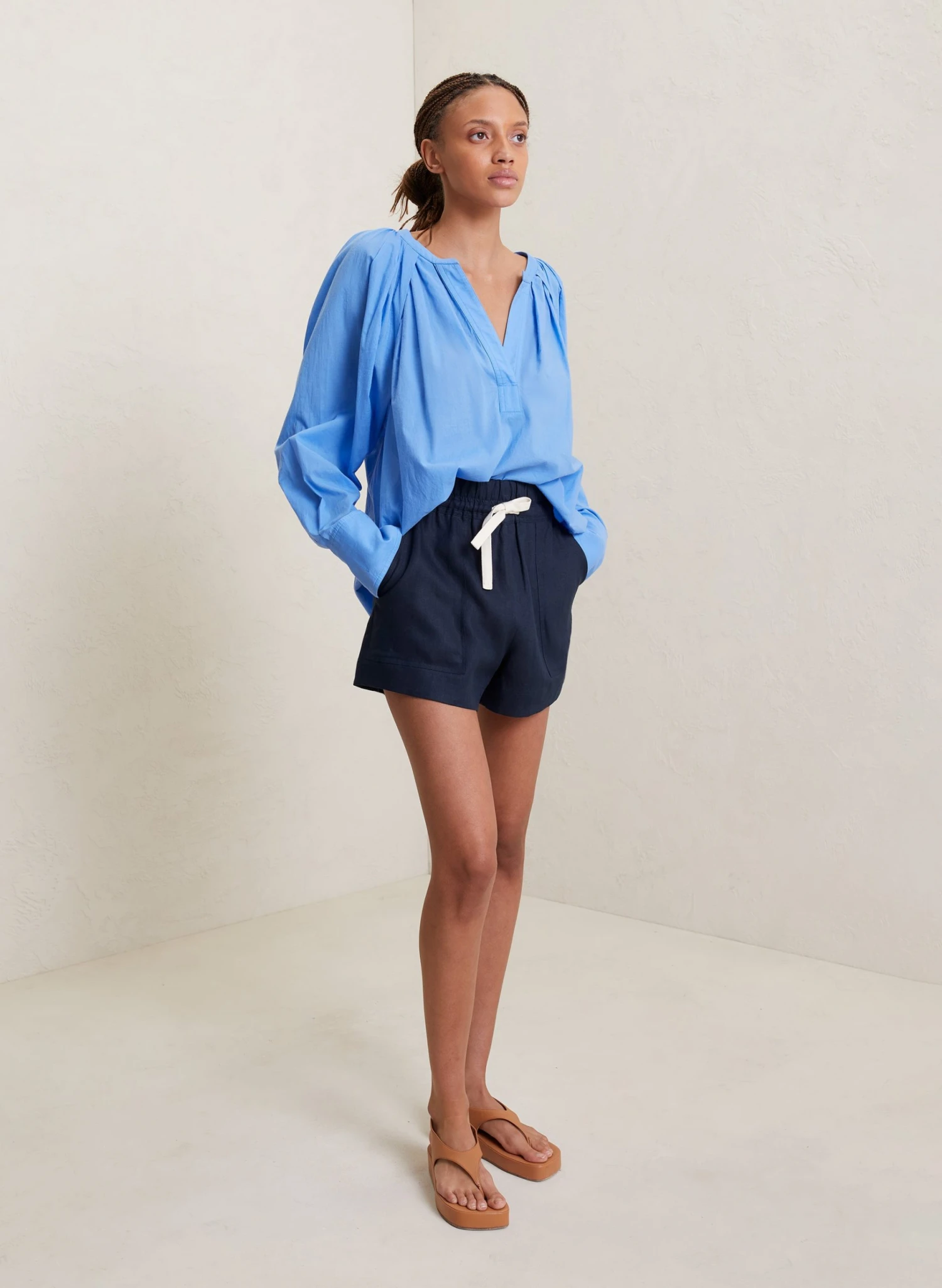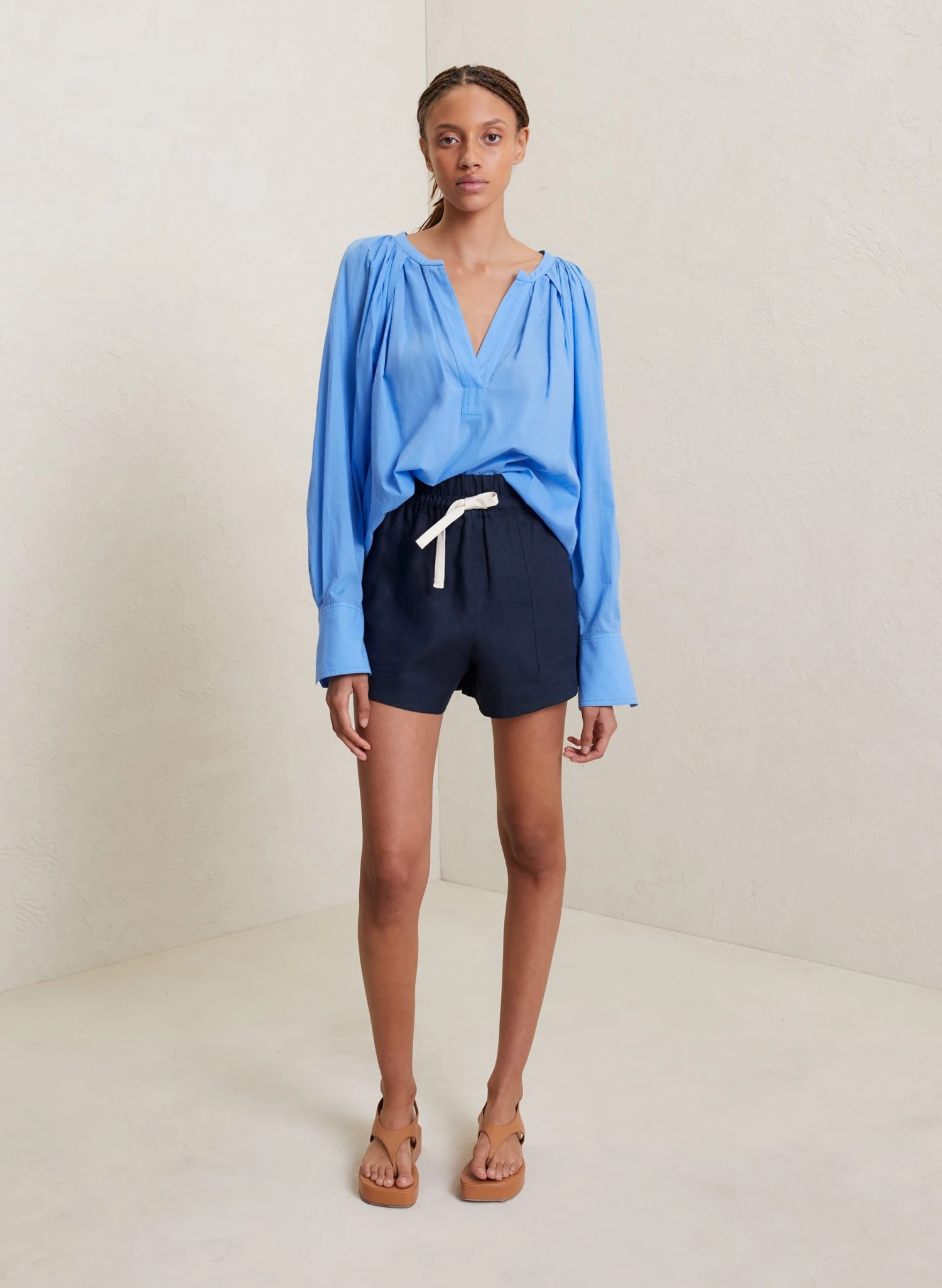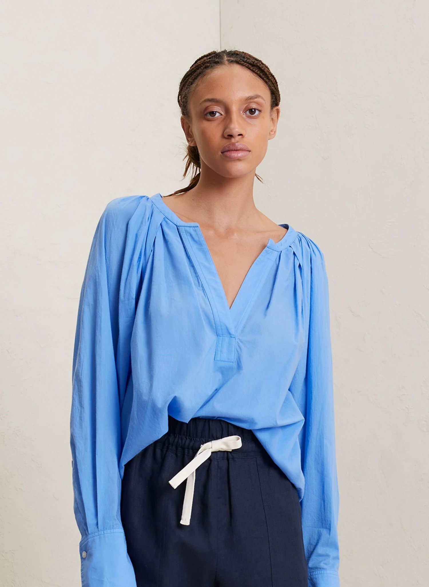 The Nomad Top is crafted from cotton voile in a sea blue hue. This voluminous and pleated silhouette features long cuffed sleeves and a V-shaped placket neckline.