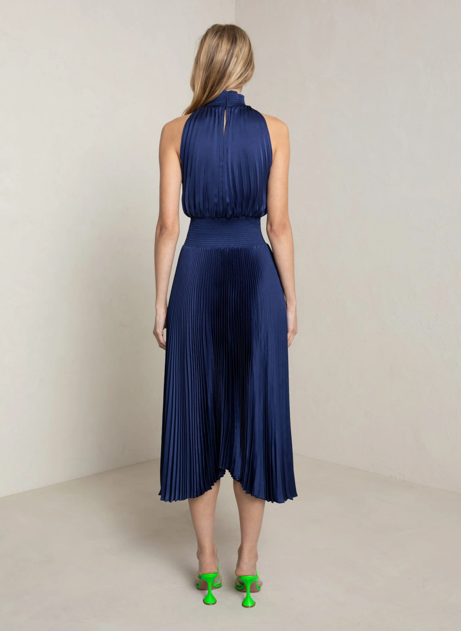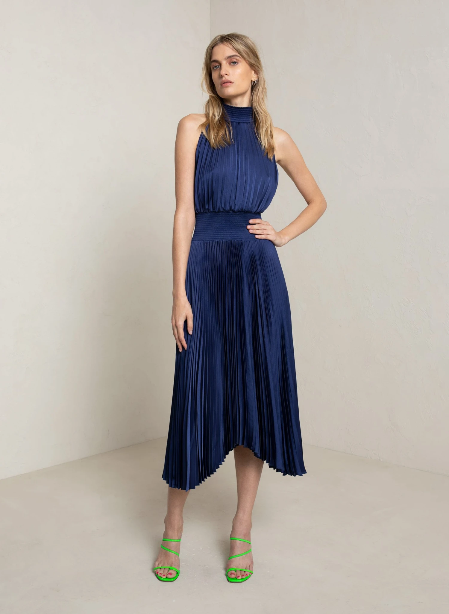 The Renzo Dress is crafted from lustrous vintage satin in an elegant teal hue. This midi silhouette features a halter neckline, smocked waist, and asymmetric hemline. Shop Dresses