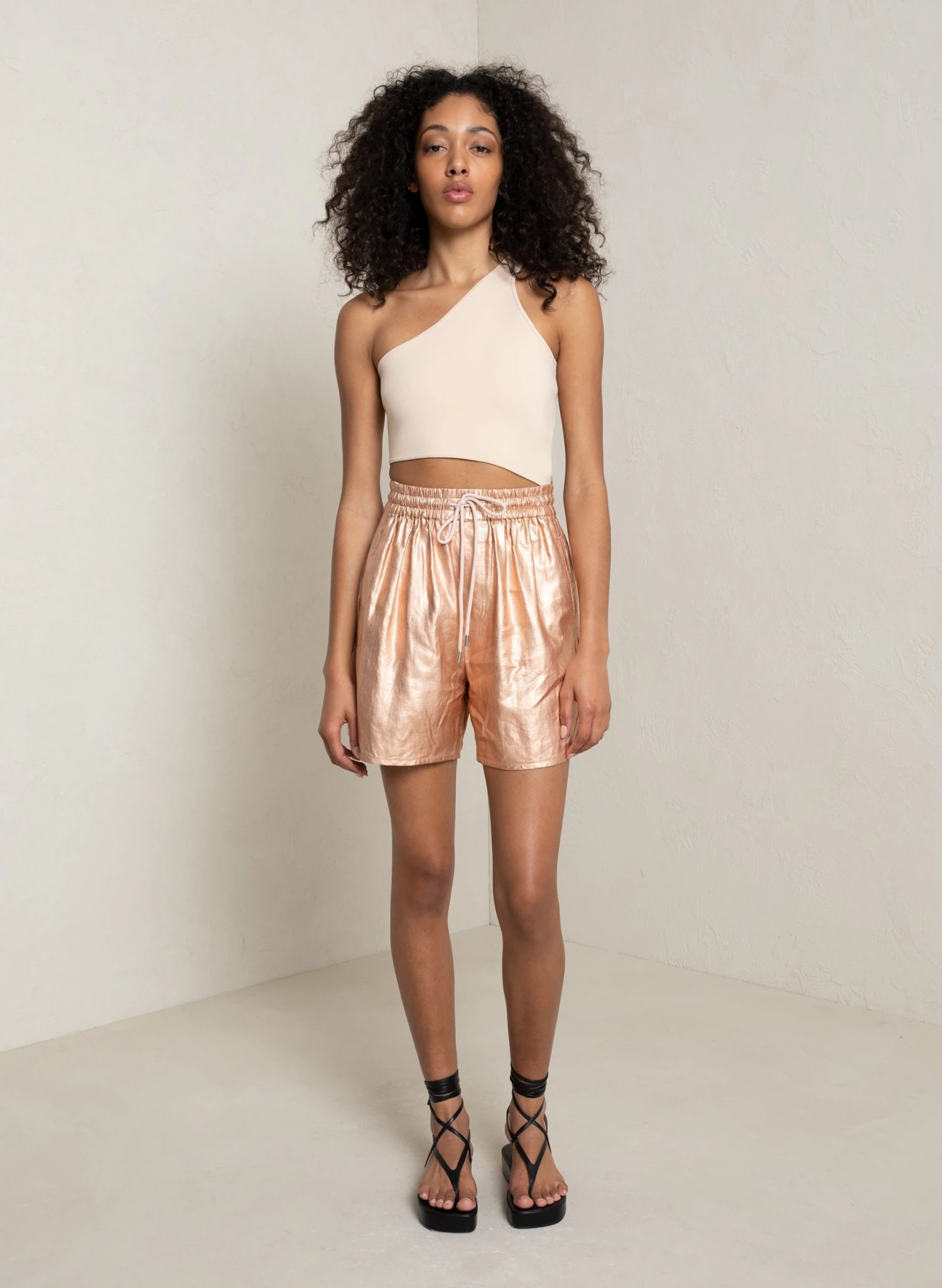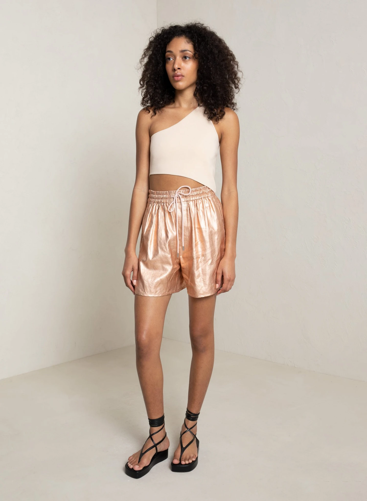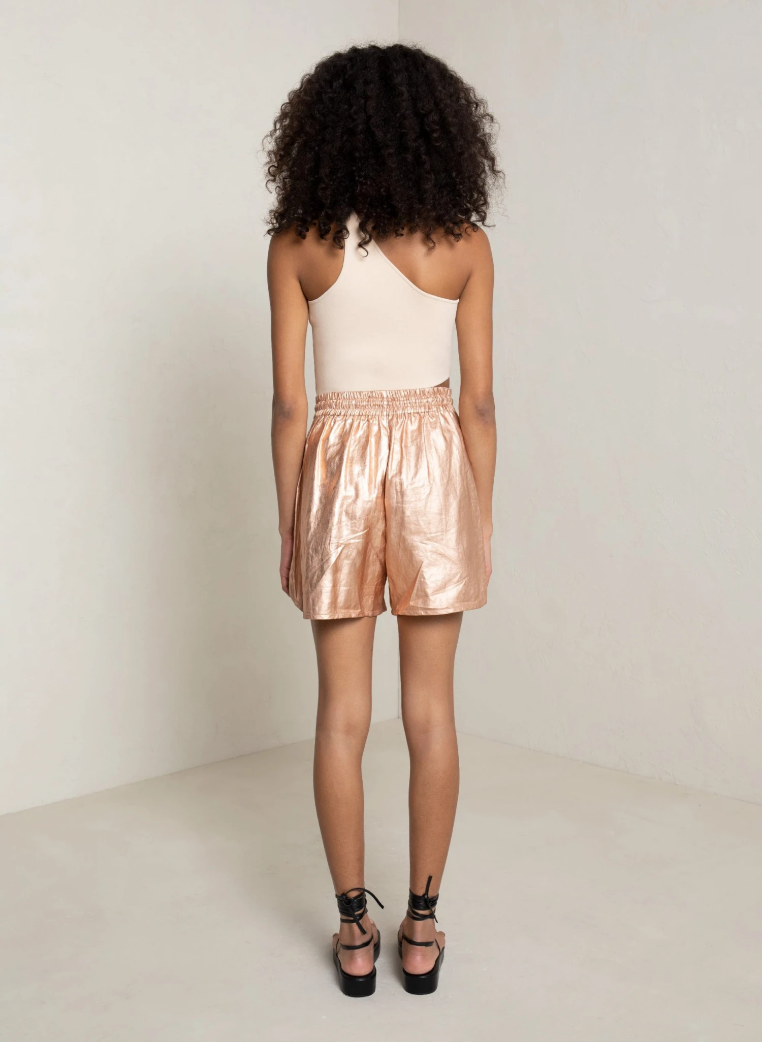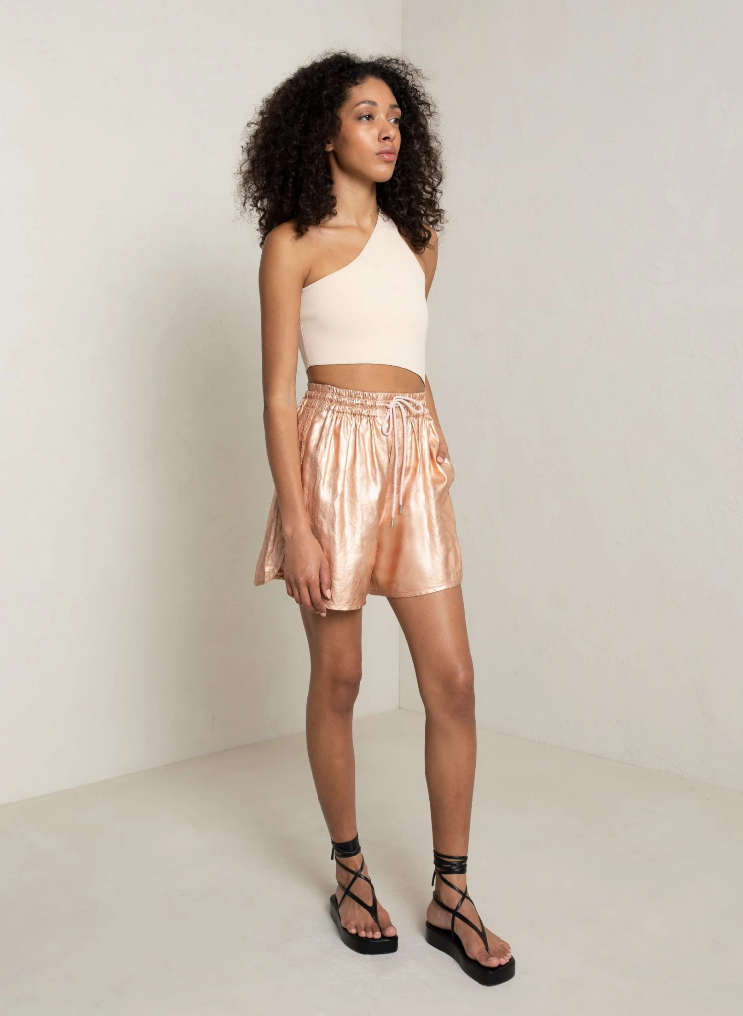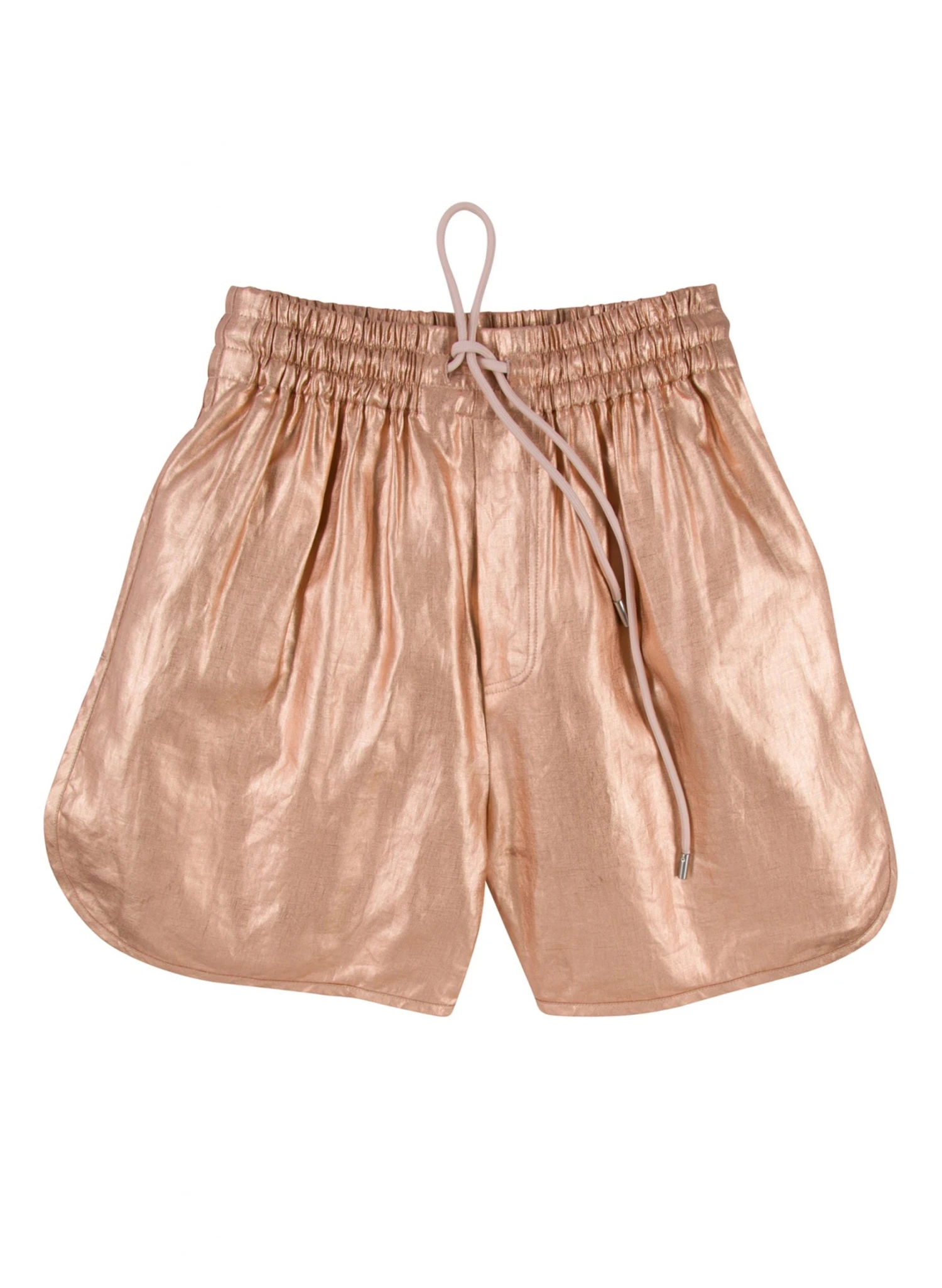 The Ryder Short is crafted from our foil-coated linen in shimmering rose gold. This sleek silhouette features an elasticized drawstring waist and is designed for a loose fit hitting at mid-length. We recommend sizing down for a less-oversized fit.