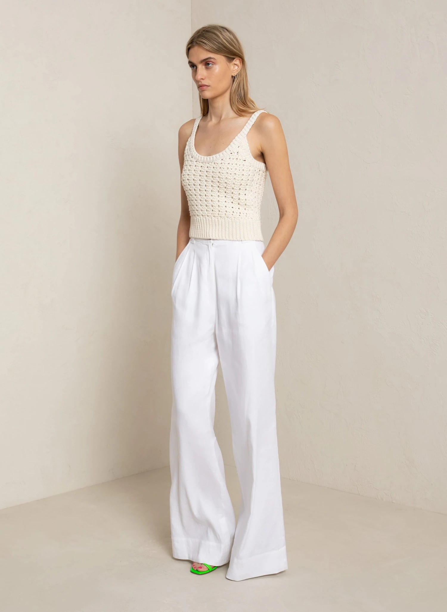 The Tommy Pant is crafted in our stretch cotton-linen blend in an off-white hue. This pleated silhouette is intended to fit with a subtle slouch, featuring a low-rise waist and wide legs. We recommend to size down one size from your typical size.