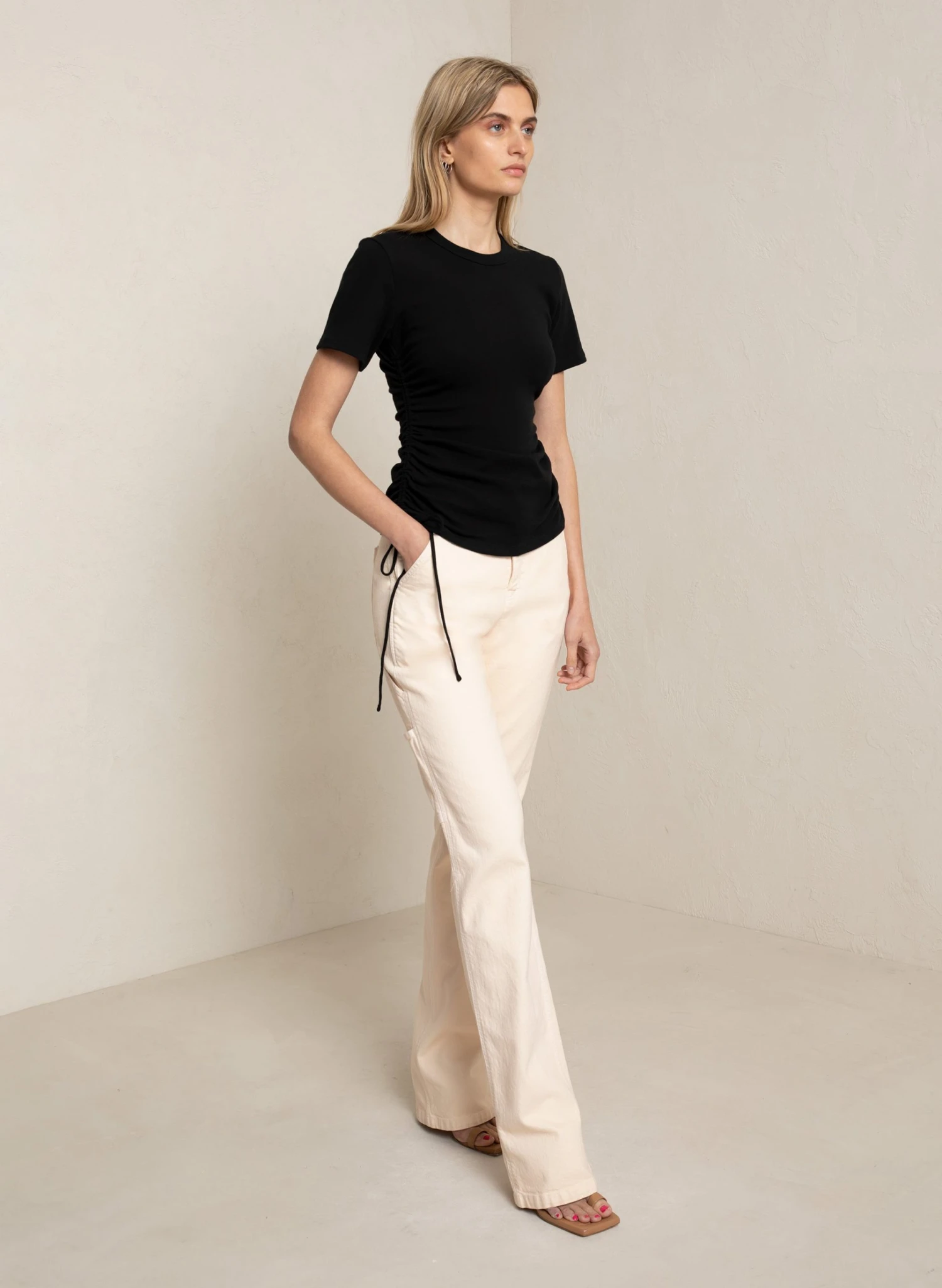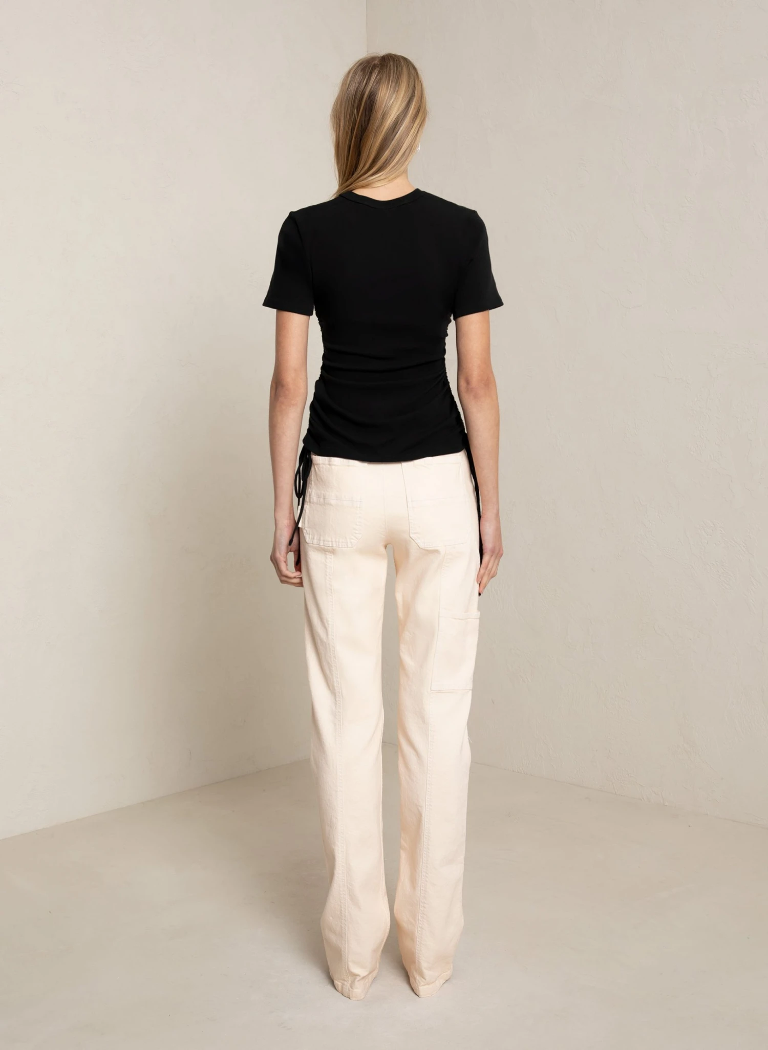 The Austin Tee is crafted from our soft vintage ribbed cotton in wardrobe-essential black. This crewneck silhouette features short sleeves and ruched detailing along the side to wear long or cropped.