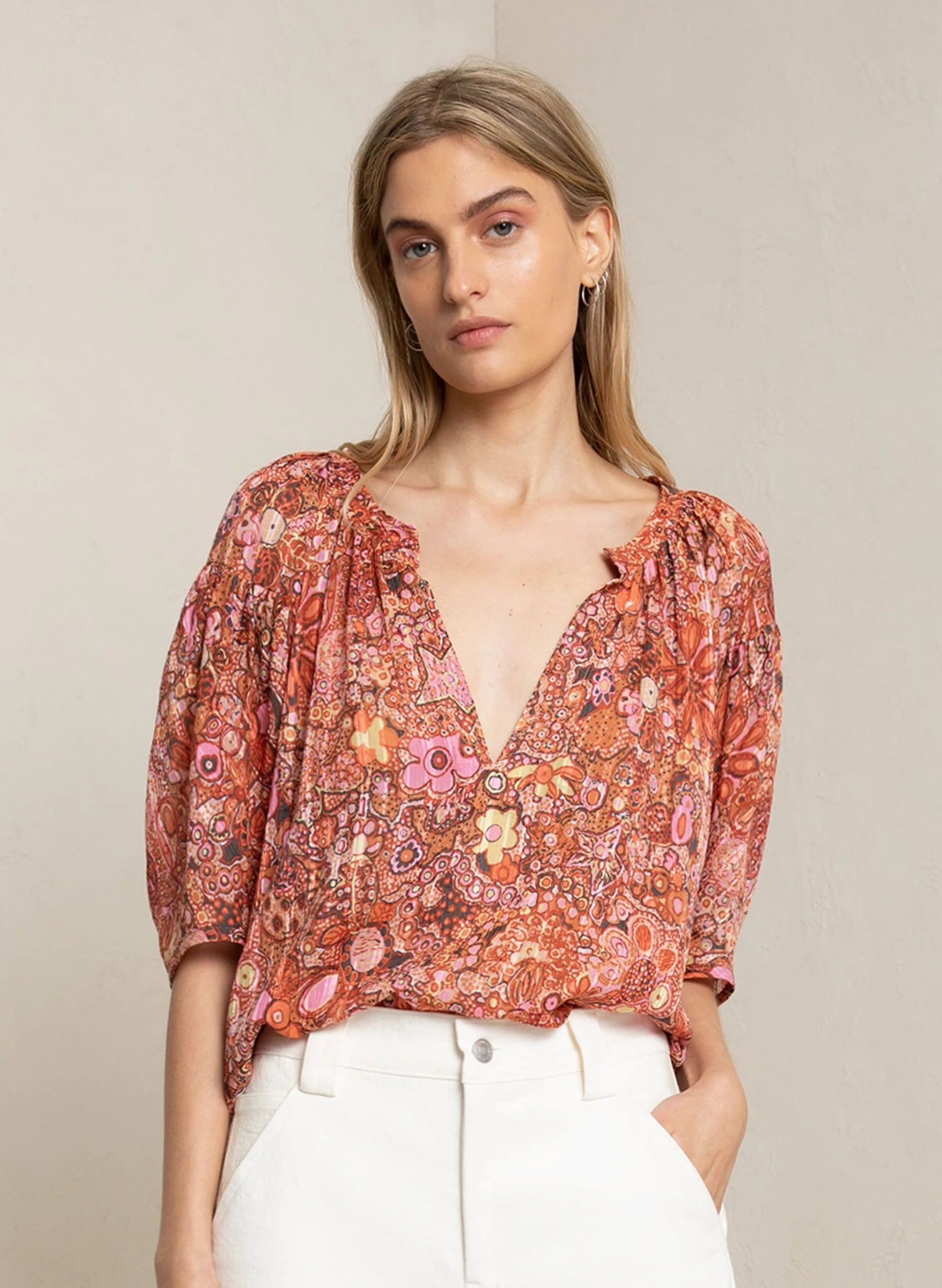 The Julianna Top is crafted in our crinkle cotton-silk blend in a retro-inspired floral print. This fluid silhouette features dropped, elbow-length puff sleeves, and a V-shaped neckline.