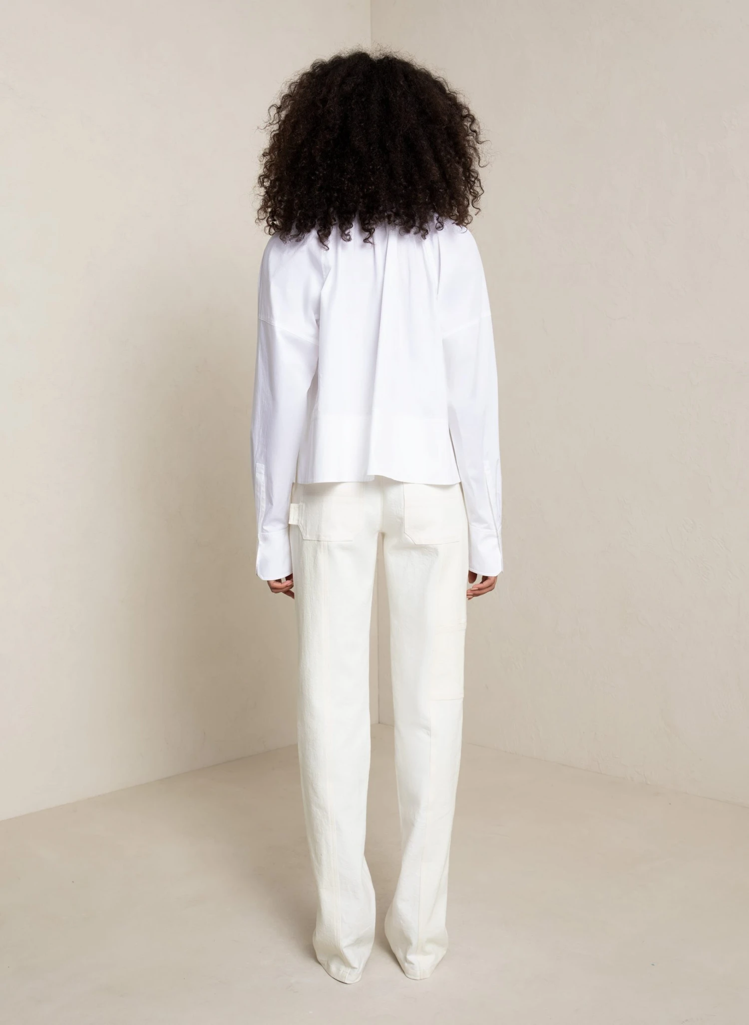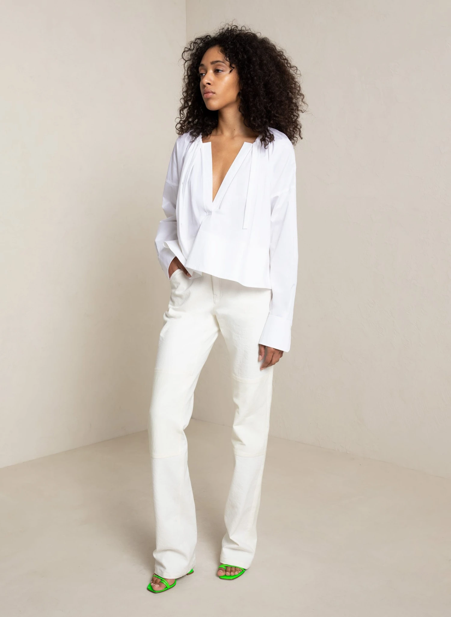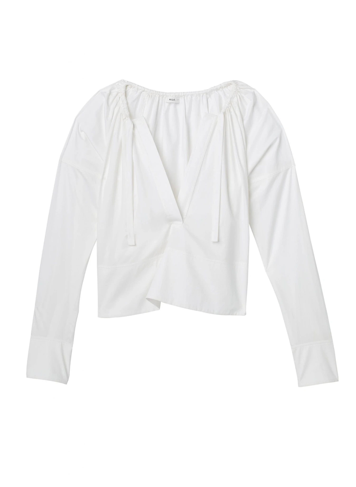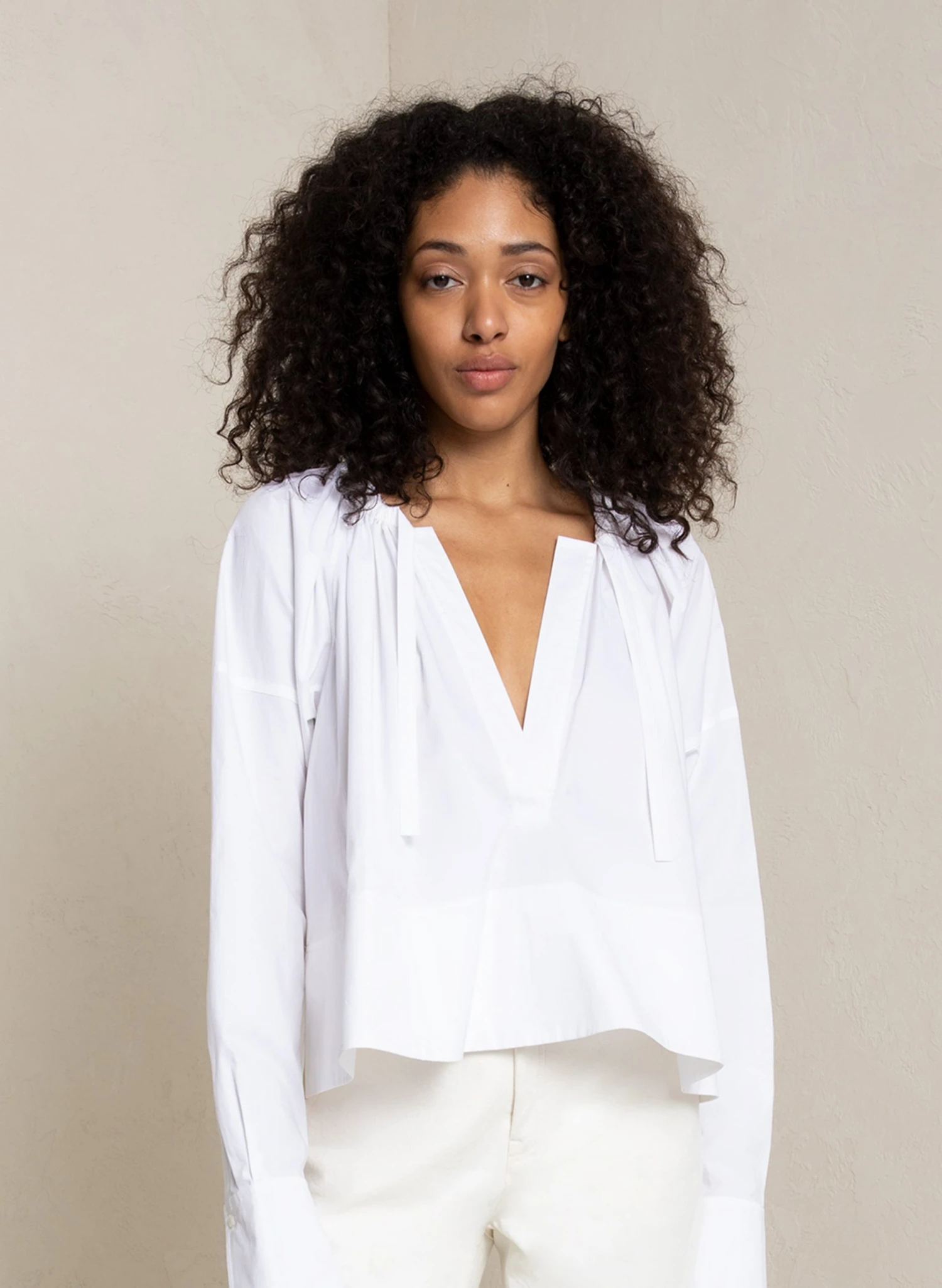 The Serena Top is crafted in our crisp day cotton in wardrobe-essential white. This floaty silhouette features long, cuffed sleeves and a rounded drawstring neckline that dips into a V.